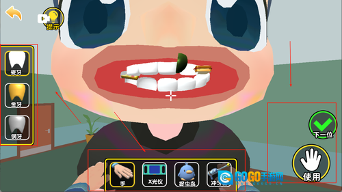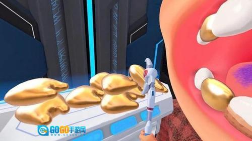 屏幕下侧是工具选择区,右侧则是操作界面,通过点击与滑动的配合,能够完成注射麻醉剂、清除蛀牙、安装假牙等各类精细操作。