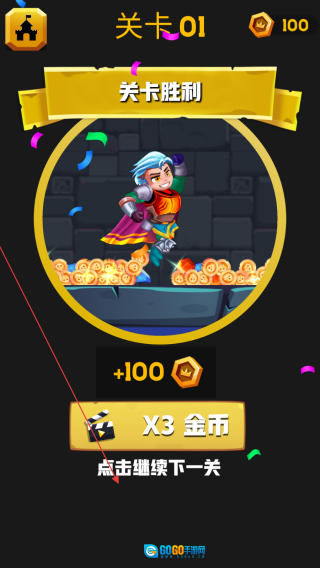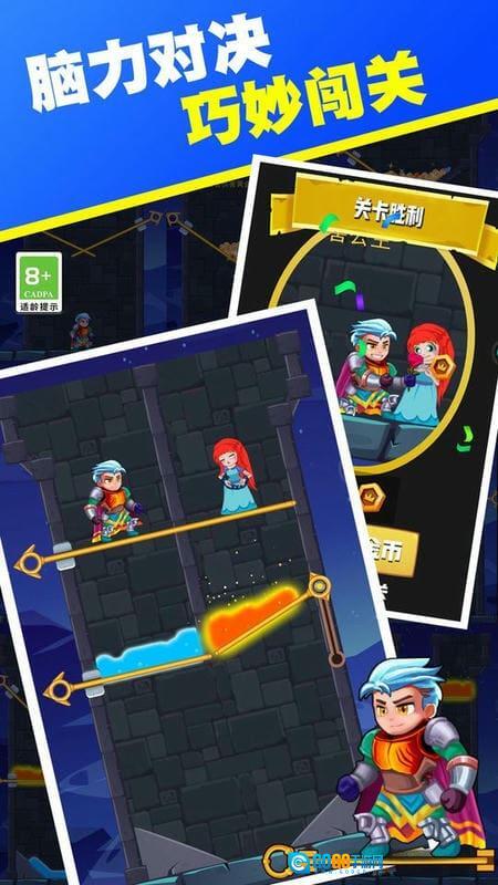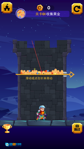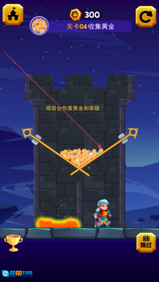 进入关卡,滑动插销,让黄金落至英雄处。