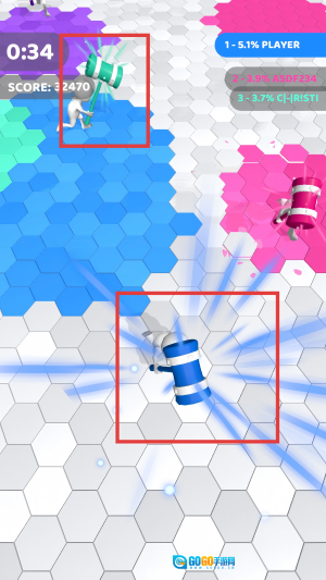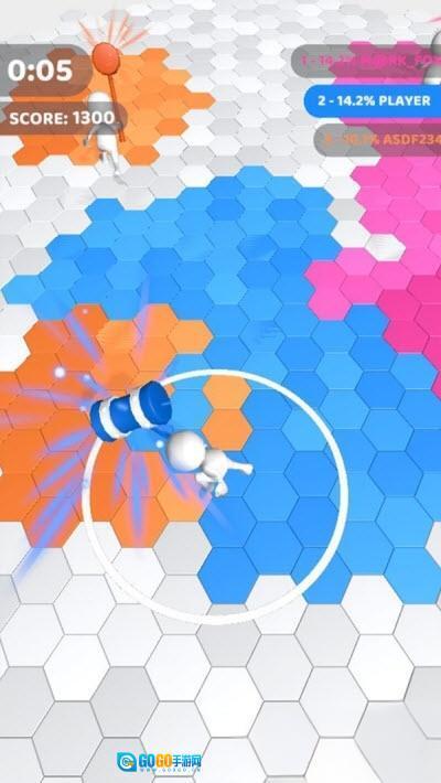 操控角色携带武器在蜂窝状地图中移动,通过占领橙色区域来拓展自身领地。