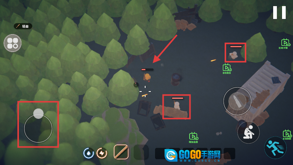 战斗时,通过左侧摇杆操控角色移动,对准敌鸭进行射击,击败它们后收集掉落的物品,要留意躲避敌人的攻击。