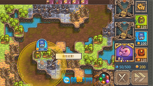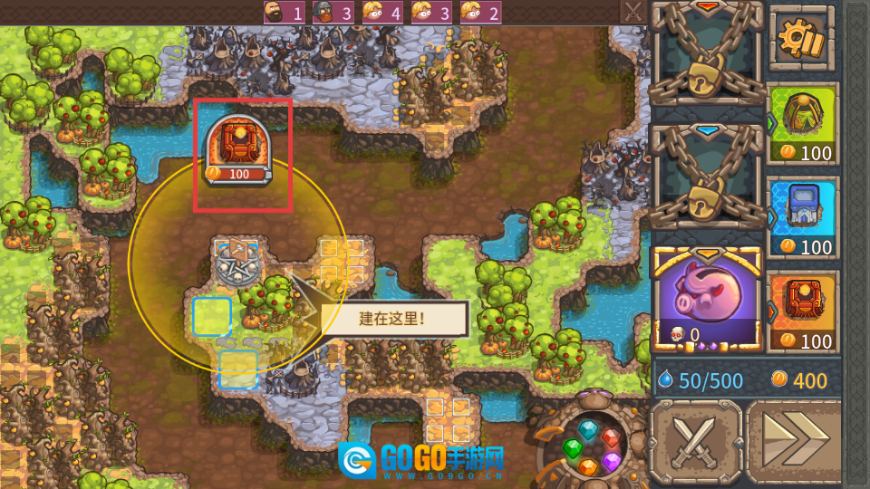 挑选需要消耗100金币的建筑,依据提示把它建造在指定的位置上,以此来搭建防御类建筑。