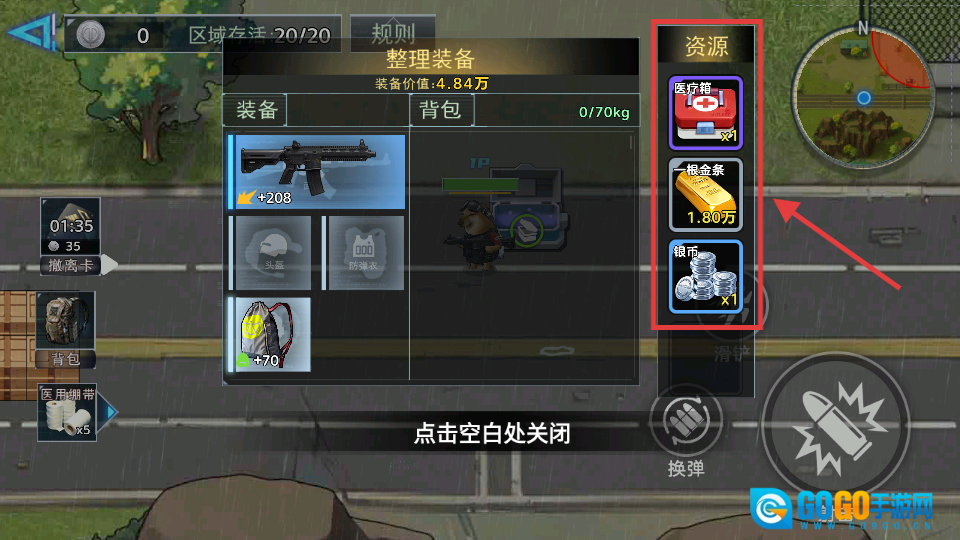 拾取【医疗箱】【金条】【银币】,医疗箱可用于回血,金条和银币能够增强战力,记得合理分配背包空间。