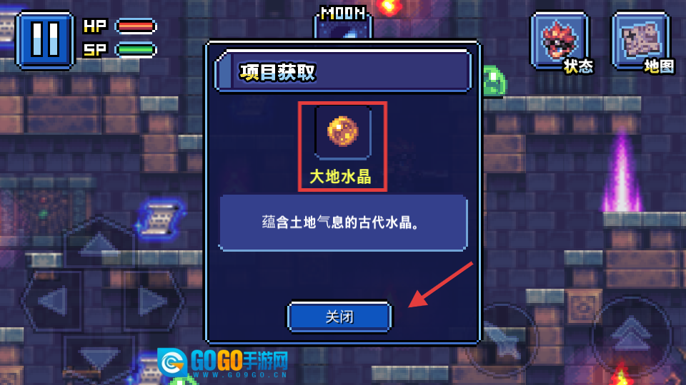 获取【大地水晶】后,点击【关闭】按钮,继续在地下城中探索,并利用道具推动剧情发展。