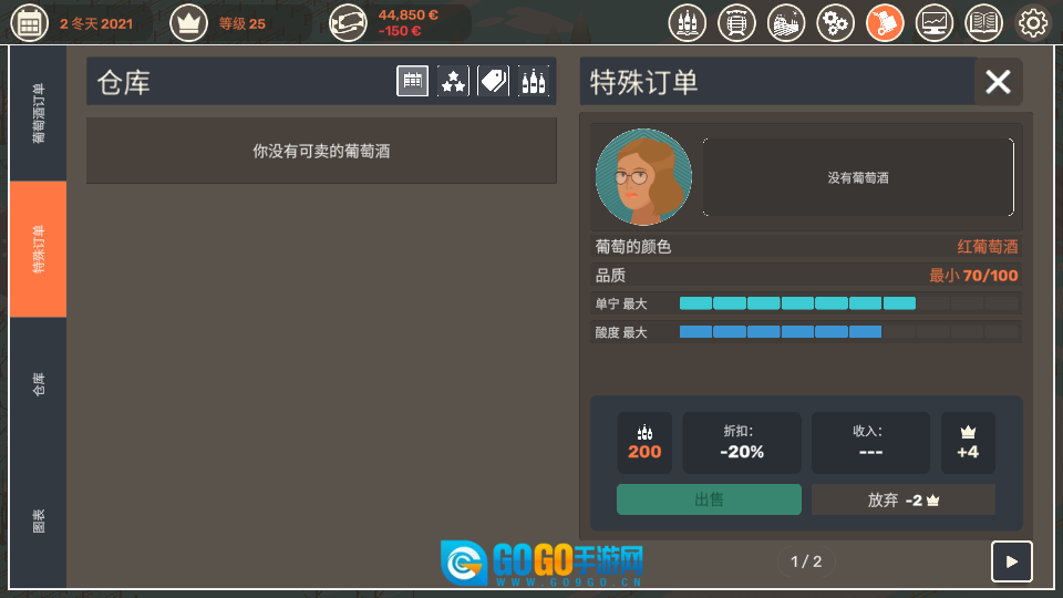 在特殊订单界面里,订单的具体要求是【红葡萄酒】,且其品质需达到【70/100】及以上。当满足这些条件后,你可以选择点击【出售】按钮来获取收益,要是不想接这个订单,点击【放弃】的话则会损失皇冠。