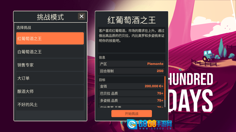 在挑战选择界面,选定【红葡萄酒之王】这一挑战,浏览【Piemonte】【250】回合等目标要求后,点击【开始挑战】按钮,即可启动酒庄经营挑战。