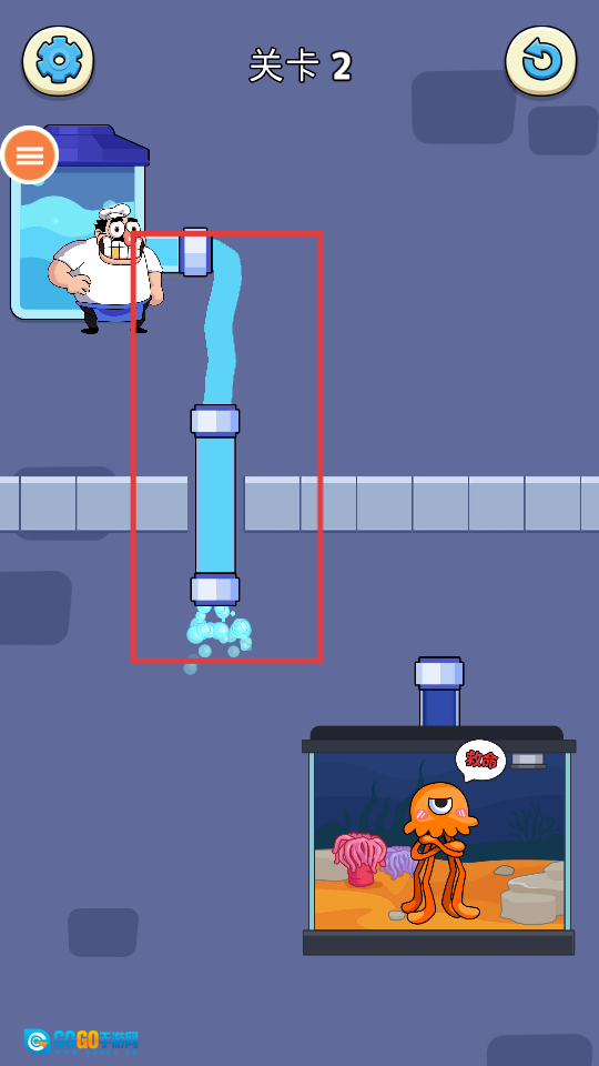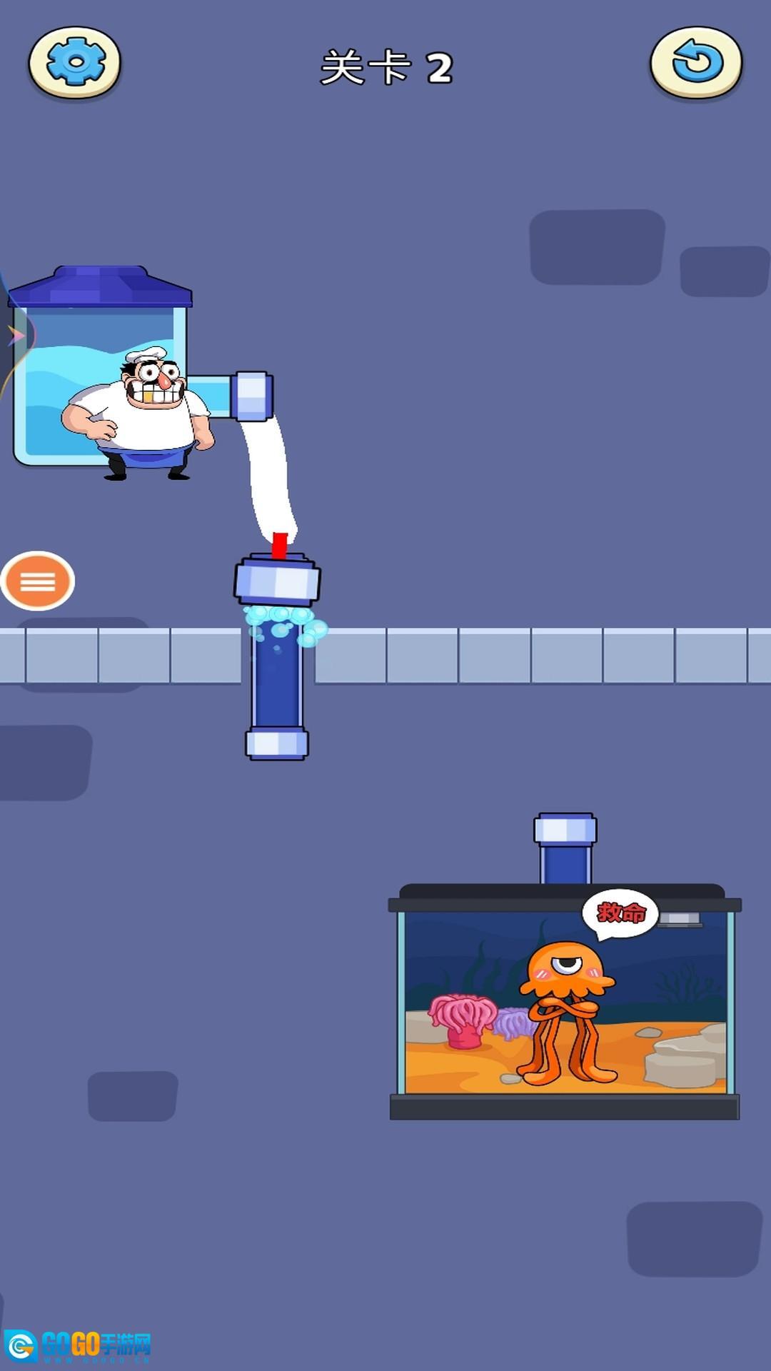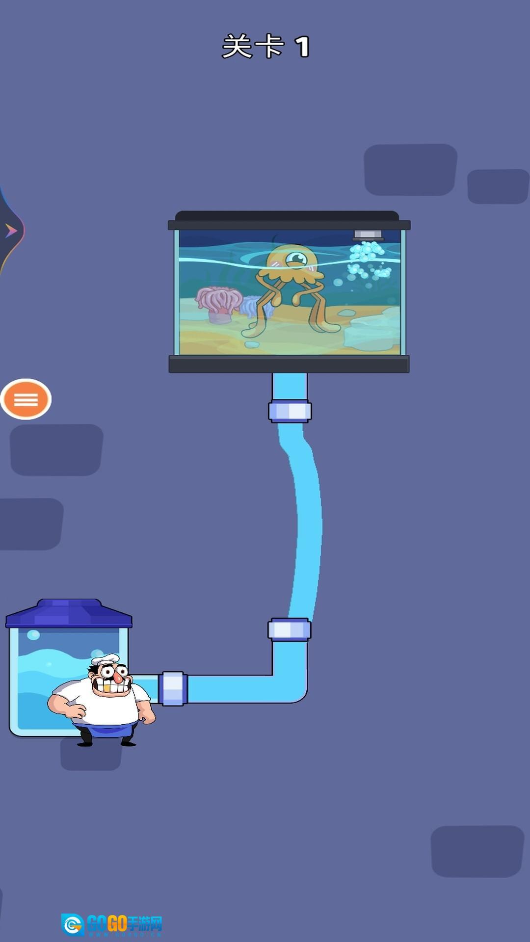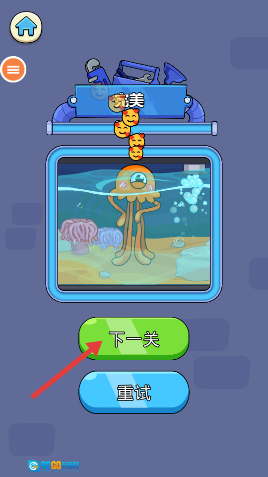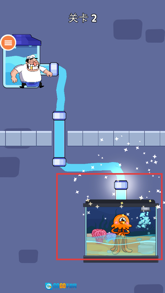 已成功把水导入鱼缸,救出章鱼,达成关卡目标,赢得游戏奖励。