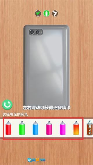 在颜色栏里左右滑动,就能切换更多喷漆颜色;选中心仪的颜色(比如蓝色)后,就可以对手机壳进行喷涂了。
