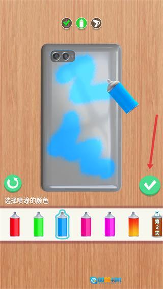使用选中的喷漆(比如蓝色),在手机壳表面喷涂出你想要的图案,等完成之后点击【√】来确认,这样就能推进手机壳的制作流程了。