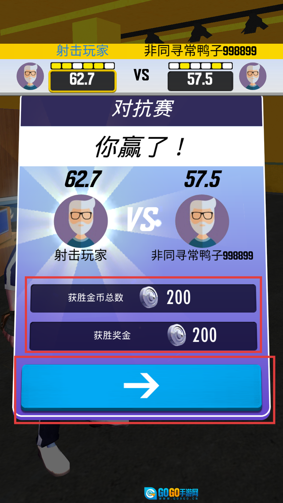 赢得比赛后,点击蓝色箭头就能继续挑战新对手,多和不同玩家切磋交流,精进自己的技术吧。