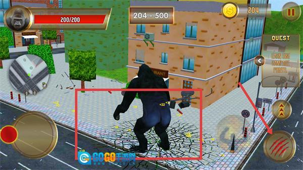 操控金刚在红色框内的区域破坏建筑与设施,以此获取金币和经验,进而提升战力。