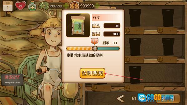 1、在进货界面挑选豆皮这类食材,点击“立即购买”按钮,消耗金币来补充库存,比如把豆皮的库存从30往上提升。