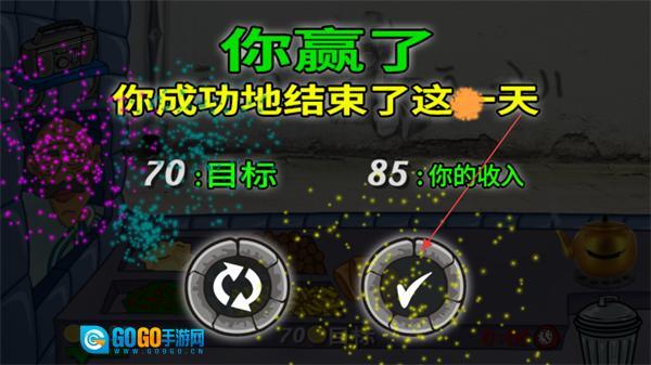 4、达成目标数量后,会触发“你赢了”的结算界面,点击对勾按钮即可结束当前关卡。