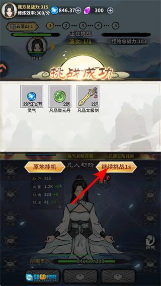 3、战斗胜利后点击继续挑战按钮,这是推进关卡进度的核心操作,选择后会进入下一个战斗关卡,持续积累资源与提升角色实力,助力成长。