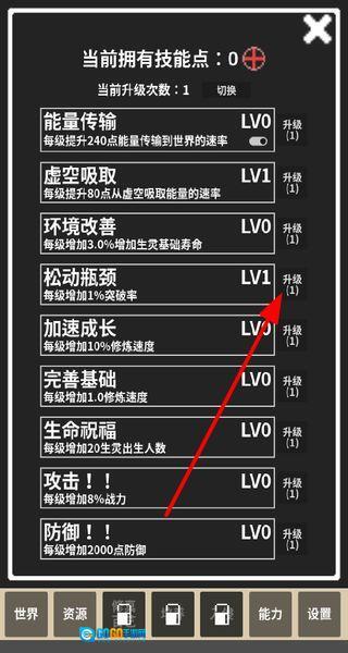 4、使用技能点来升级各项技能,例如提高能量传输的速率,或是延长生灵的基础寿命,技能升级之后能够加快修真世界的发展进程。