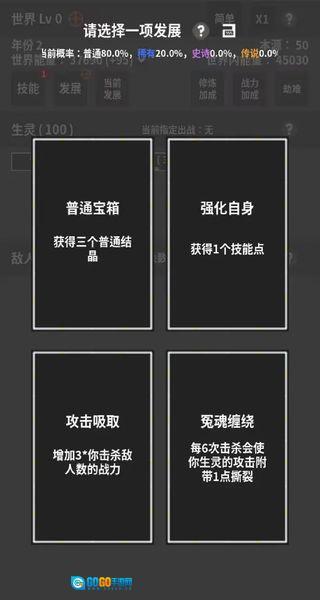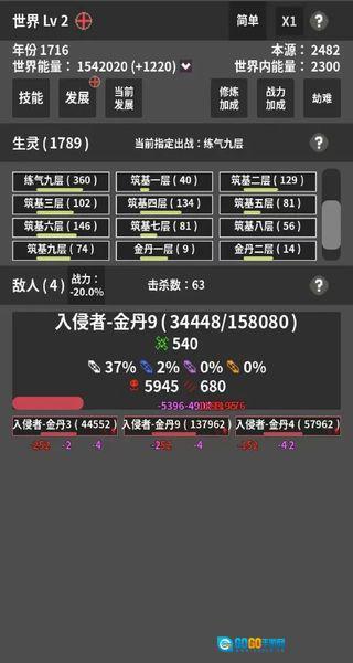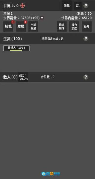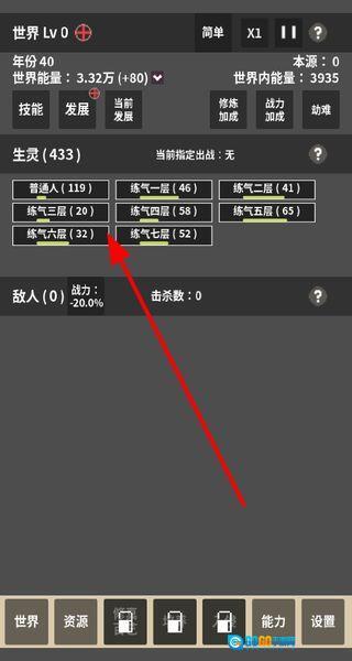 1、查看处于不同境界的生灵数量,挑选指定要出战的生灵,积累世界能量与世界内能量,与此同时留意敌人战力的变化情况。