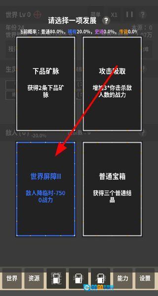2、在发展选项里挑选一项,例如选择获取矿脉来提升资源,或是选择世界屏障以降低敌人威胁,不同的选择会带来不一样的效果。