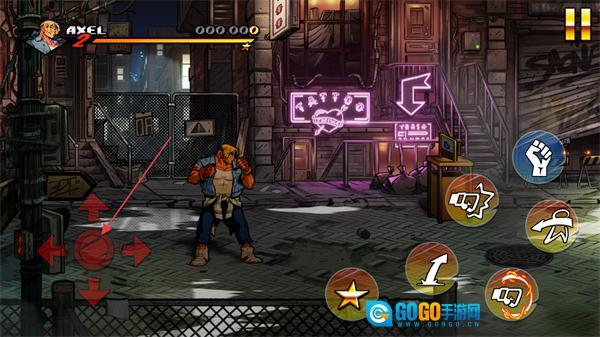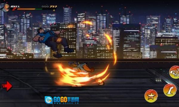3、战斗关卡中用左侧方向键控制角色移动,右侧按键触发攻击,在街头场景击败敌人推进关卡。
