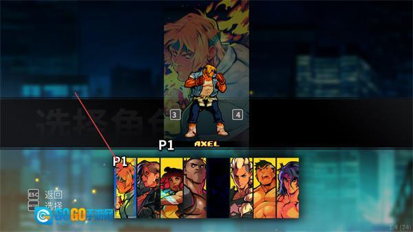 2、在角色选择界面为P1选定角色,不同角色有独特攻击与技能特性,选定后进入战斗关卡。