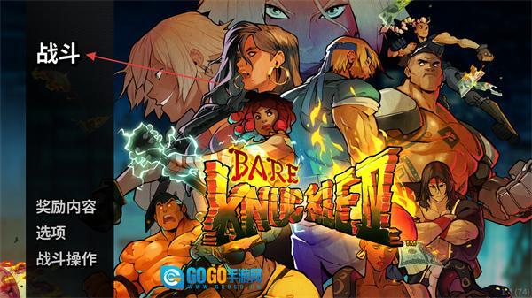 1、打开怒之铁拳4启动界面,点击左侧战斗选项进入核心剧情关卡,同时可查看奖励内容、战斗操作等辅助功能。