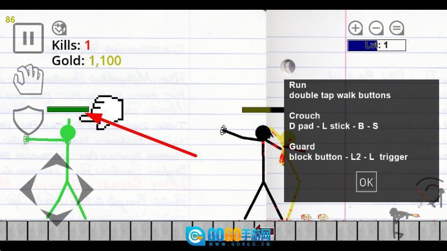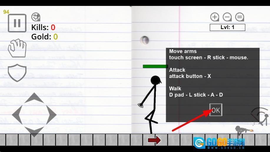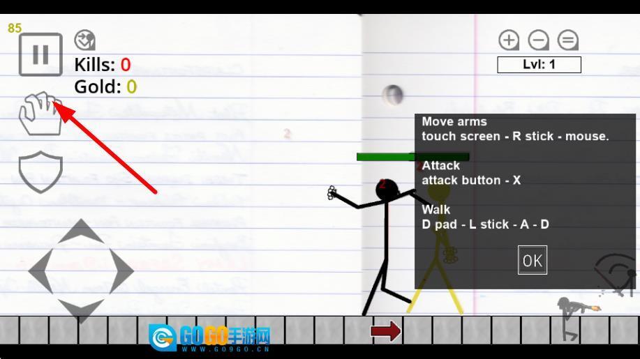 1、点击OK按键,即可关闭操作说明弹窗,正式进入游戏的战斗场景。