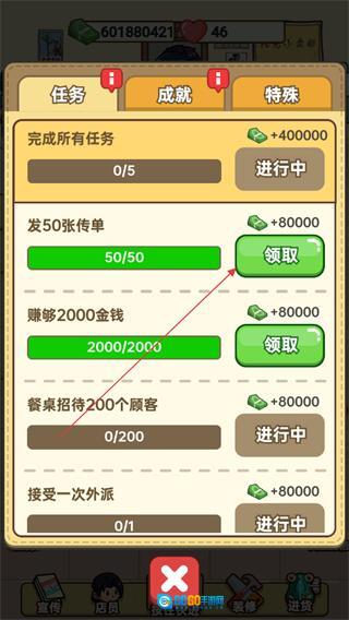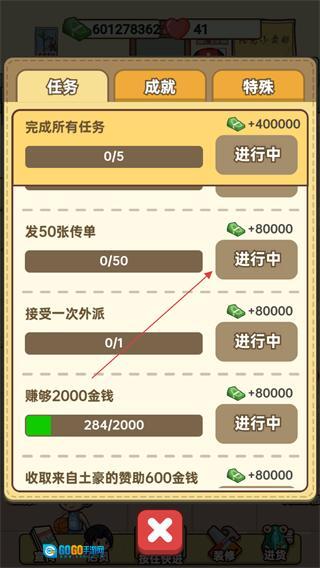 1、进入任务界面,查看发50张传单等任务进度。
