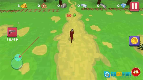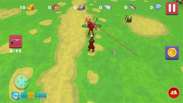 2、进入关卡后,通过左侧的方向控制按钮操控角色移动,同时可使用左侧的武器当前为手枪,收集路径上的资源来推进关卡。