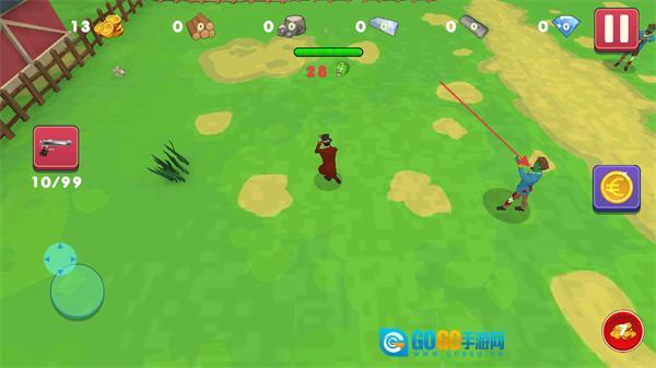 1、进入界面后,找到下方绿色的PLAY按钮并点击,即可进入游戏关卡,界面上方还有COWBOY、FARM等标识可后续进行对应操作。