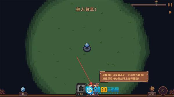 2、看到兽人将至的提示后,优先建造采集器来采集矿产,将其拖动到战场上完成建造以获取资源。