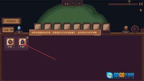 1、在该界面选择采集器和炮塔,采集器可帮你收集矿产,炮塔用于防御,选好对应设施后准备开启战斗。