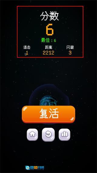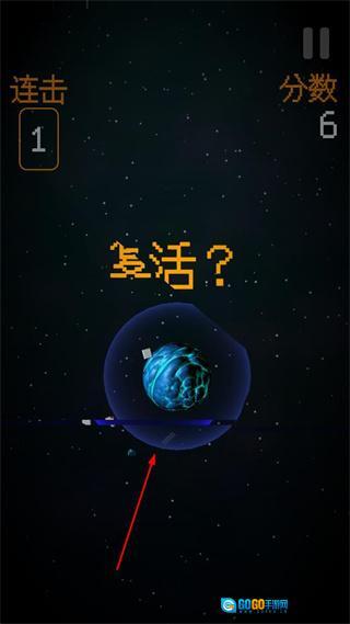 3、当飞船与星球发生碰撞时,界面会弹出复活提示,玩家可在此选择是否进行复活来继续游戏进程。