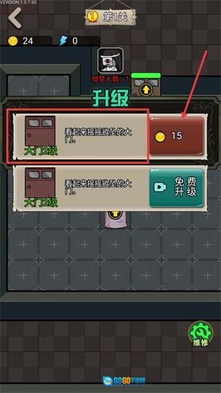 积累金币后,优先把【大门】升级到2级来提升防御能力,要是想节省资源的话,也能通过观看广告来免费升级。