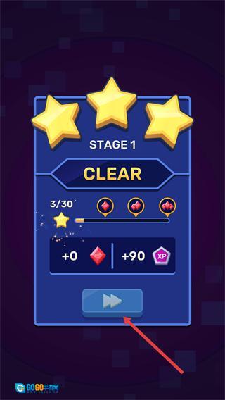 关卡完成后会显示【STAGE-1-CLEAR】,并获得三星评价,点击箭头按钮即可进入下一关,继续进行粉碎砖块的挑战。
