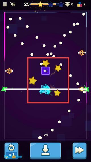 击碎砖块后会触发奖励特效,红框区域随即出现星星、道具等奖励,收集这些奖励后能提升关卡收益。