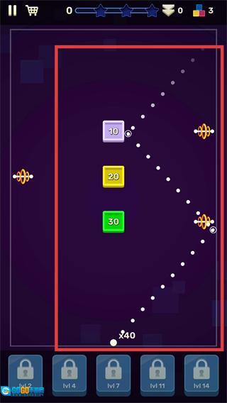 在关卡界面中,你需要操控红框内的弹球发射器,对准上方带有【10】【20】【30】标识的砖块,为击碎它们获取分数做好准备。