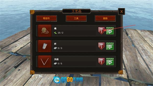 2、进入工艺品的零部件标签页后,查看绳类等物品的材料需求情况,若材料符合相应要求,点击按钮即可完成制作,这些是建造建筑所需的基础部件。