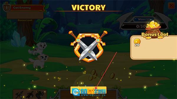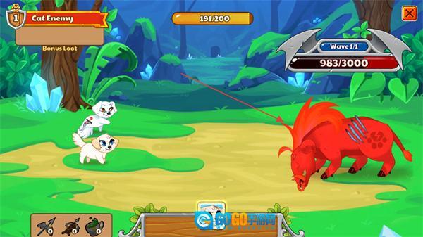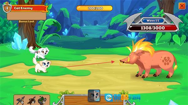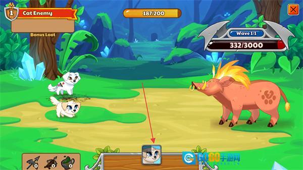1、操控猫咪单位对敌方野猪发起攻击,降低其血量,以推进Wave1/1的战斗进程。