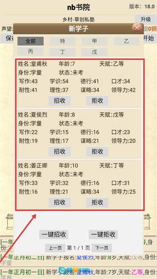 在新生列表里能查看学子【皇甫秋-夏侯烈】的属性,点击【招收】或【拒收】按钮来筛选合适的门生。