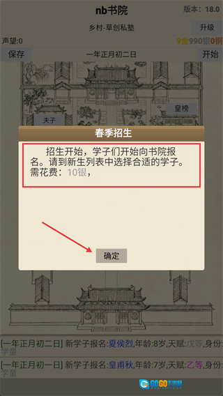 在春季招生阶段,系统会提示需要消耗【10银】,点击【确定】按钮后就能进入新生选择界面。