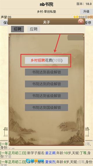 在夫子的招聘界面里,乡村级别的招聘需要消耗【10银】;而县级及以上级别的招聘选项,则得等书院升级之后才能解锁。