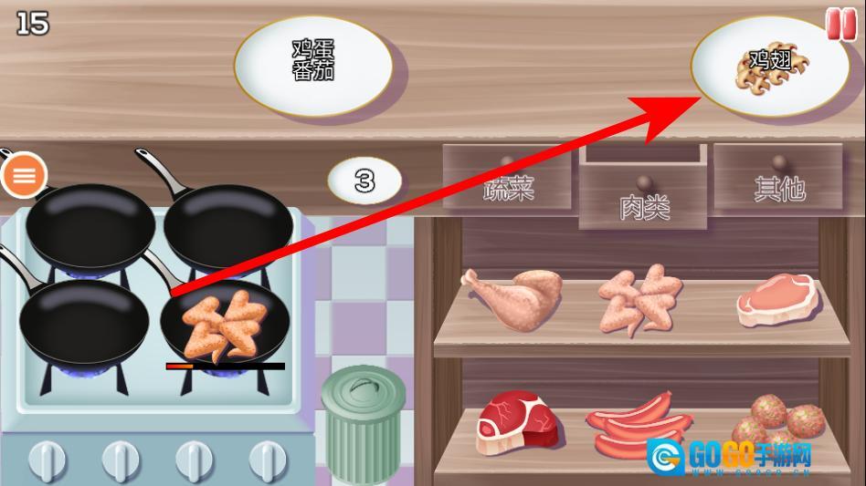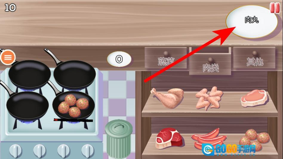 进入关卡后,查看上方的菜品需求(比如肉丸),然后从食材区的对应分类里挑选所需食材。