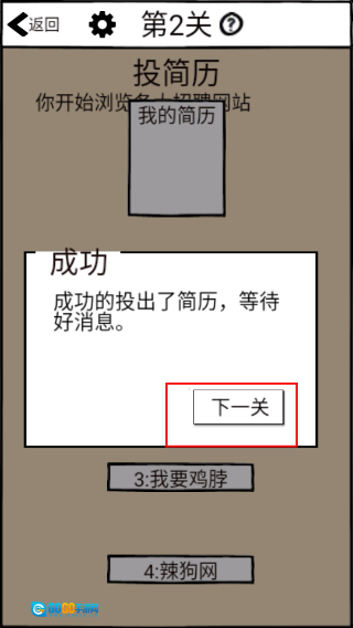 投简历成功后会弹出提示框,点击框内的【下一关】按钮,就能进入后续关卡继续挑战。