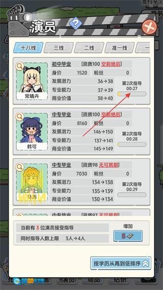 1、在演员界面中,能够查看常晴卉等演员的属性,待指导倒计时结束后,就可以提升他们的能力相关数值。