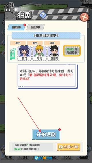 2、进入拍剧界面,选择“重生回到18岁”短剧,点击“开拍短剧”按钮,等待倒计时结束即可完成拍剧。