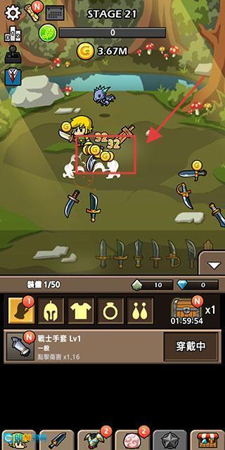 【STAGE21】战斗获取金币后,可购买勇士手套之类的装备,以此提升角色属性,增强【BladeCrafter2】的战斗能力。