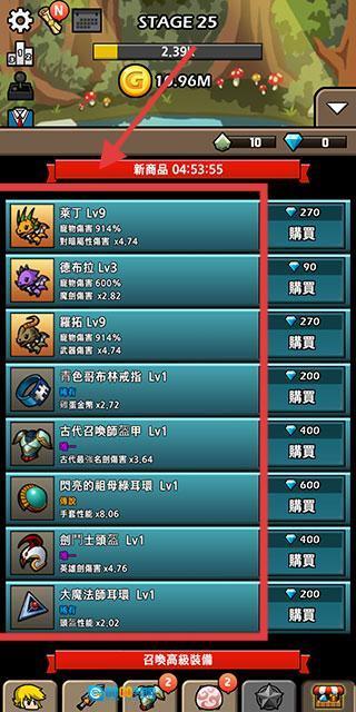 在【STAGE25】的新商品界面,使用钻石购买宠物和装备,以此提升整体战力,从而推进【BladeCrafter2】的关卡进度。