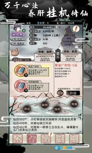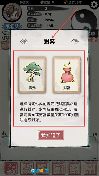 当寿元或财富达到指定数量时,可选择【寿元】或【财富】开启对弈,消耗七成对应资源,尝试获取随机的修仙助力。