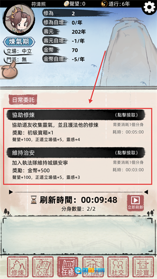 在日常委托里,你可以消耗分身来接取【协助修炼】或者【维持治安】这两类任务,这样就能快速得到声望、金币之类的修仙资源,进而提升自身实力。