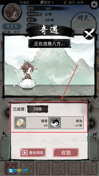 奇遇游历结束后,你可以选择【收取】奖励,也能开启后【双倍领取】,这样能获得更多声望和修为,从而加快修仙进度。