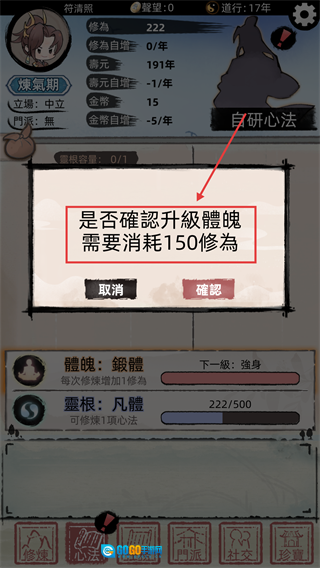 当修为积累到足够程度时,你就能够确认对【体魄】进行升级操作。此时消耗150点修为,便能提升体魄等级,这将有助于你在后续的修仙渡劫过程中更加顺利。