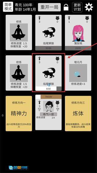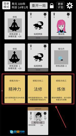 前期选择【炼体】作为修炼方向,不仅能让基础体魄翻倍,战斗后还能恢复体魄;再搭配上【修炼】卡片来快速提升修为,就能更好地助力推图闯关。